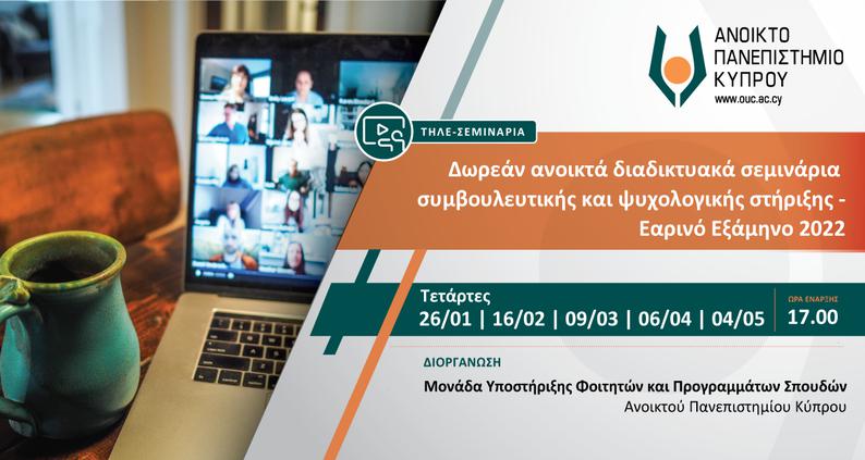 Σε συνέχεια της μεγάλης ανταπόκρισης που είχε ο δωρεάν κύκλος ανοικτών διαδικτυακών σεμιναρίων, τον οποίο εγκαινίασε το 2021 η Μονάδα Υποστήριξης Φοιτητών και Προγραμμάτων Σπουδών του Ανοικτού Πανεπιστημίου Κύπρου (ΑΠΚΥ), με στόχο την καλύτερη δυνατή εξατομικευμένη φοιτητική εμπειρία, διοργανώνεται νέος κύκλος σεμιναρίων το τρέχον Εαρινό Εξάμηνο 2022.