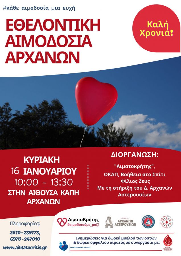 Εθελοντική Αιμοδοσία θα πραγματοποιηθεί την Κυριακή 16/01/2022 στην αίθουσα ΚΑΠΗ Αρχανών και ώρες 10:00-13:30. Την αιμοδοσία διοργανώνει ο Παγκρήτιος Σύνδεσμος Εθελοντών Αιμοδοτών και Δωρητών Οργάνων Σώματος «Αιματοκρήτης» με τη στήριξη του Δήμου Αρχανών Αστερουσίων, του ΟΚΑΠ και του προγράμματος Βοήθεια στο Σπίτι και τη συμμετοχή του Φίλιου Ζευς.