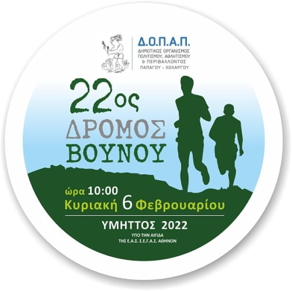 Ο Δημοτικός Οργανισμός Πολιτισμού Αθλητισμού & Περιβάλλοντος Παπάγου – Χολαργού προκηρύσσει τον “22ο Δρόμο Βουνού – Υμηττός 2022”, ο οποίος θα διεξαχθεί την Κυριακή 6 Φεβρουαρίου 2022.