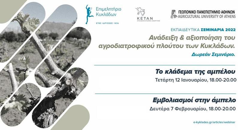 «Γενάρη μήνα κλάδευε, φεγγάρι μη γυρεύεις» λέει ο σοφός λαός, έτσι το πρώτο σεμινάριο που θα πραγματοποιηθεί την Τετάρτη 12 Ιανουαρίου 2022 αφορά τις σωστές πρακτικές κλαδέματος των αμπελιών στις Κυκλάδες, ενώ το δεύτερο θα πραγματοποιηθεί την Δευτέρα 7 Φεβρουαρίου 2022 με θέμα τους εμβολιασμούς των αμπελιών.