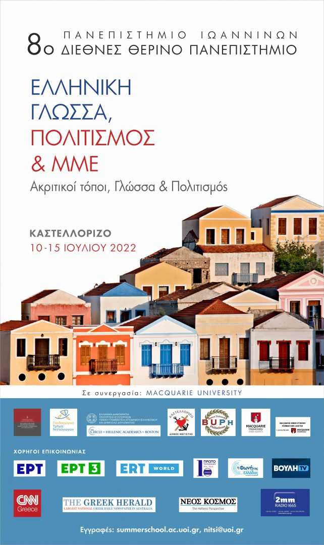 Το Εργαστήριο Μελέτης Κοινωνικών Θεμάτων, Μέσων Ενημέρωσης και Εκπαίδευσης του Παιδαγωγικού Τμήματος Νηπιαγωγών της Σχολής Επιστημών Αγωγής του Πανεπιστημίου Ιωαννίνων, σε συνεργασία με το Πρόγραμμα Νεοελληνικών Σπουδών του Τμήματος Μέσων Μαζικής Ενημέρωσης, Επικοινωνίας, Καλών Τεχνών, Γλωσσών και Λογοτεχνίας της Σχολής Ανθρωπιστικών Σπουδών του Macquarie University (Department of Media, Communications, Creative Arts, Language and Literature, Faculty of Arts), και την υποστήριξη του Ιδρύματος Macquarie Greek Studies Foundation, στο Σίδνεϊ της Αυστραλίας, και με τη συμμετοχή: του Κύκλου Ακαδημαϊκών της Βοστώνης (The Circle of Hellenic Academics in Boston), και των Boston University Philhellenes της Βοστώνης, διοργανώνει το 8ο Διεθνές Θερινό Πανεπιστήμιο «Ελληνική Γλώσσα, Πολιτισμός και ΜΜΕ».