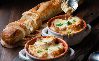 Ρίξτε τη σούπα σε πήλινα μπολ σερβιρίσματος ασφαλή για το φούρνο και τοποθετήστε μια φέτα ψωμί πάνω από το καθένα (μπορείτε να το σπάσετε σε κομμάτια αν προτιμάτε).