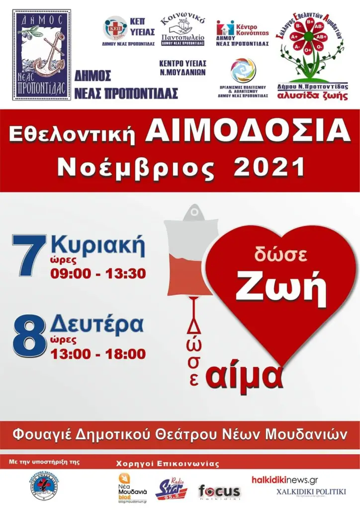 Διήμερη εθελοντική Αιμοδοσία διοργανώνει ο Σύλλογος Εθελοντών Αιμοδοτών του Δήμου Ν. Προποντίδας “Αλυσίδα Ζωής” στο φουαγιέ του δημοτικού θεάτρου Ν. Μουδανιών στις 27 και τις 28 Φεβρουαρίου.