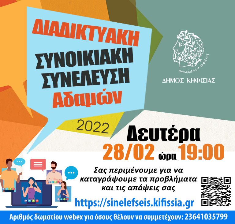 – Δευτέρα 28/02 και ώρα 19.00 Διαδικτυακή Συνοικιακή Συνέλευση με τη συμμετοχή των κατοίκων της συνοικίας Αδαμών