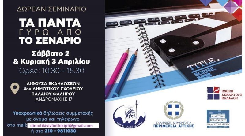 Ο Δήμος Π.Φαλήρου και οι Δημοτικές Βιβλιοθήκες σε συνεργασία με την Περιφέρεια Αττικής και την Ένωση Σεναριογράφων Ελλάδος, διοργανώνει ταχύρρυθμο δωρεάν σεμινάριο το Σάββατο 2 και Κυριακή 3 Απριλίου στην αίθουσα εκδηλώσεων του 4ου Δημοτικού σχολείου Π.Φαλήρου (Ανδρομάχης 17, Π.Φάληρο) .