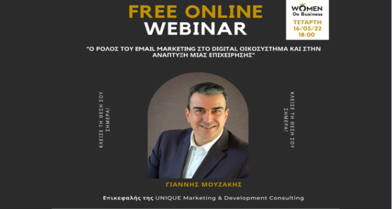 Νέο δωρεάν Online Webinar του Women Do Business, την Τετάρτη 16/03/2022 στις 18:00, με τίτλο: “Ο ρόλος του Email Marketing στο Digital οικοσύστημα και στην ανάπτυξη μιας επιχείρησης” με τον Γιάννη Μουζάκη.