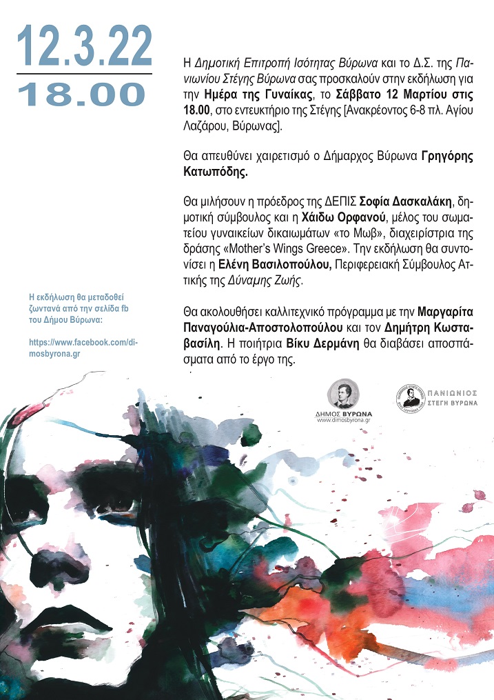 Η Δημοτική Επιτροπή Ισότητας (ΔΕΠΙΣ) Βύρωνα και το Δ.Σ. της Πανιωνίου Στέγης Βύρωνα, σας προσκαλούν στην εκδήλωση για την Ημέρα της Γυναίκας, το Σάββατο 12 Μαρτίου στις 18.00, στο εντευκτήριο της Στέγης (Ανακρέοντος 6-8 Πλ. Αγίου Λαζάρου, Βύρωνας).