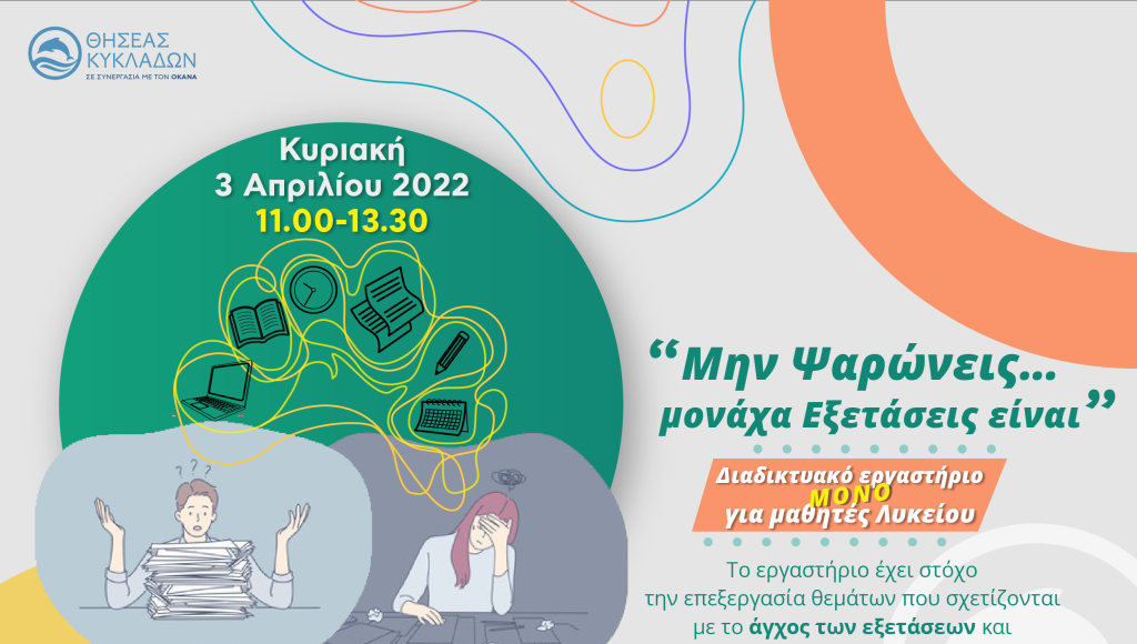 Το Κέντρο Πρόληψης «ΘΗΣΕΑΣ ΚΥΚΛΑΔΩΝ» στο πλαίσιο των παρεμβάσεων με κεντρικό θέμα το Άγχος των Εξετάσεων διοργανώνει δύο δράσεις για γονείς και μαθητές.