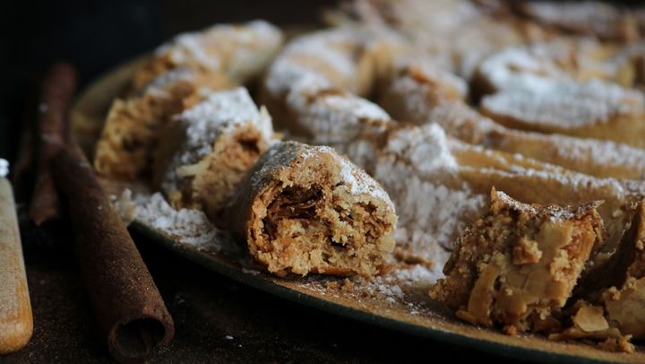 Στον πάγκο εργασίας ανοίγουμε τα νωπά φύλλα κρούστας. Με ένα κουτάλι απλωνουμε ταχίνι καλής ποιότητας πάνω στα φύλλα. Πασπαλίζουμε από πάνω με καστανή ζάχαρη. Τυλίγουμε προσεκτικά το φύλλο σε χαλαρό ρολό. Με το μαχαίρι κόβουμε σε μπουκιές μετρίου μεγέθους.