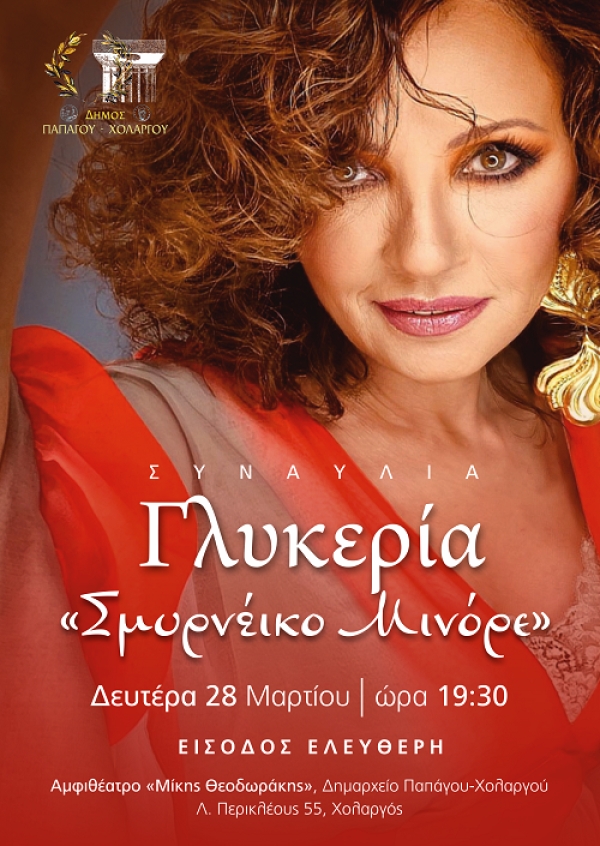 Η συναυλία «Σμυρνέικο Μινόρε», με την ερμηνεύτρια Σμυρνέικου και παραδοσιακού τραγουδιού Γλυκερία, θα πραγματοποιηθεί στο αμφιθέατρο «Μίκης Θεοδωράκης» του δημαρχείου Παπάγου – Χολαργού τη Δευτέρα 28 Μαρτίου, στις 19:30. Ένα μουσικό οδοιπορικό με αφορμή τη συμπλήρωση εκατό χρόνων από τη Μικρασιατική Καταστροφή.