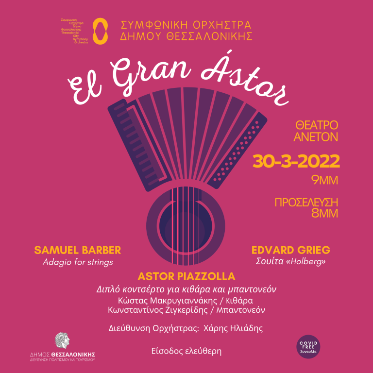 Έργα των Barber, Grieg και Piazzolla θα περιλαμβάνει η συναυλία της Συμφωνικής Ορχήστρας του Δήμου Θεσσαλονίκης, που θα πραγματοποιηθεί στο θέατρο Άνετον, την Τετάρτη 30 Μαρτίου 2022 και ώρα 21.00, με σολίστ δύο βιρτουόζους καλλιτέχνες, τον Κώστα Μακρυγιαννάκη στην κιθάρα και τον Κωνσταντίνο Ζιγκερίδη στο μπαντονεόν, υπό τη διεύθυνση του αρχιμουσικού Χάρη Ηλιάδη.