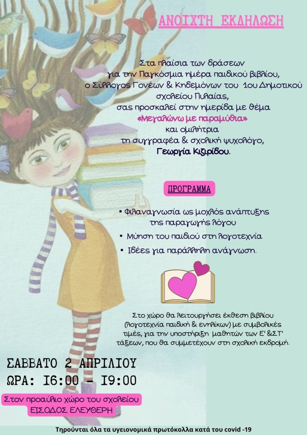 Ο Σύλλογος Γονέων & Κηδεμόνων του 1ου Δημοτικού σχολείου Πυλαίας στα πλαίσια των δράσεων για την Παγκόσμια ημέρα παιδικού βιβλίου σας προσκαλεί με απέραντη χαρά στην ανοιχτή ημερίδα με θέμα «Μεγαλώνω με παραμύθια», που θα πραγματοποιηθεί το Σάββατο 2 Απριλίου, 16:00-19:00, στον προαύλιο χώρο του σχολείου.