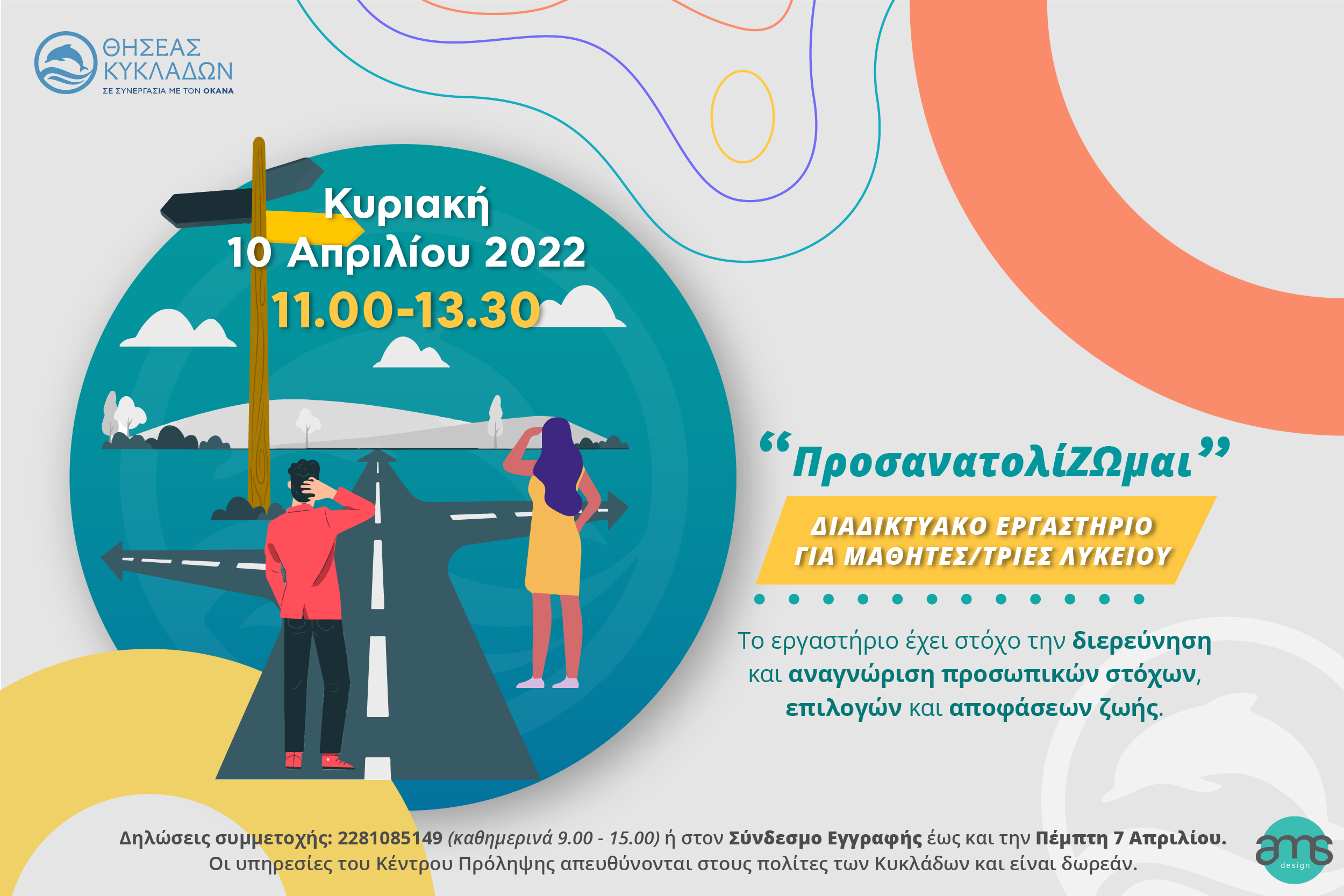 Το Κέντρο Πρόληψης «ΘΗΣΕΑΣ ΚΥΚΛΑΔΩΝ» προσκαλεί μαθητές/τριες Λυκείου να συμμετέχουνστο διαδικτυακό εργαστήριο με θέμα «ΠροσανατολίΖΩμαι» την Κυριακή 10 Απριλίου 2022, 11:00- 13:30.