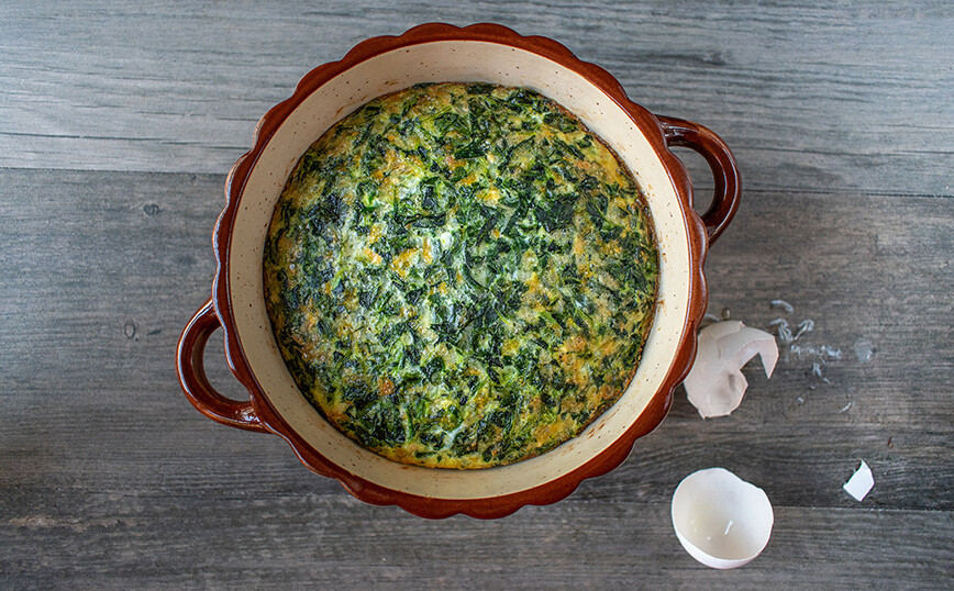 Μεταφέρετε το μείγμα στο ταψί και ψήστε στον προθερασμένο φούρνο για 35- 40 λεπτά ή μέχρι να δέσουν τα αυγά.