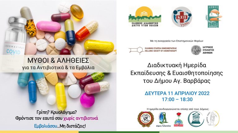 Ο Δήμος Αγίας Βαρβάρας σε συνεργασία με το Ελληνικό Διαδημοτικό Δίκτυο Υγιών Πόλεων, την Ελληνική Εταιρεία Χημειοθεραπείας και τον Ιατρικό Σύλλογο Αθηνών διοργανώνουν Διαδικτυακή Ημερίδα Εκπαίδευσης και Ευαισθητοποίησης με θέμα ‘’Μύθοι και Αλήθειες για τα Αντιβιοτικά και τα Εμβόλια’’, με την συμμετοχή των δήμων Αιγάλεω, Χαϊδαρίου, Πετρούπολης, Ιλίου και Γαλατσίου.
