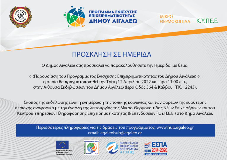 Ο Δήμος Αιγάλεω διοργανώνει Ημερίδα στο πλαίσιο της έναρξης του Προγράμματος Ενίσχυσης Επιχειρηματικότητας, την Τρίτη 12 Απριλίου, στις 11:00 στην Αίθουσα Εκδηλώσεων του Δήμου Αιγάλεω (Ιερά Οδός 364 & Κάλβου).