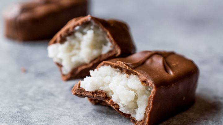 Χρησιμοποιώντας ένα πιρούνι βοητήξτε κάθε μια από τις μπάλες καρύδας στο μείγμα λιωμένης σοκολάτας