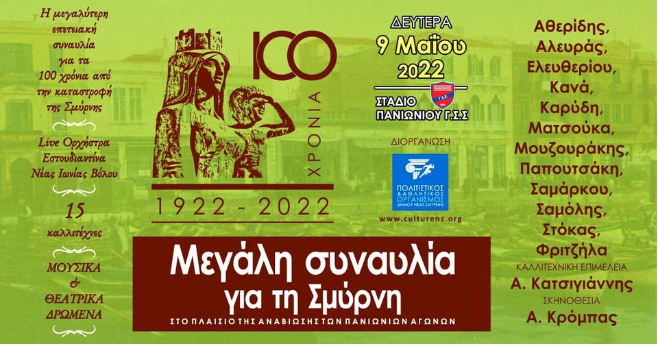 Τη μεγαλύτερη συναυλία της χρονιάς για τη Σμύρνη διοργανώνει ο Πολιτιστικός Οργανισμός Δήμου Νέας Σμύρνης, με αφορμή την επέτειο των 100 χρόνων από τη Μικρασιατική Καταστροφή.