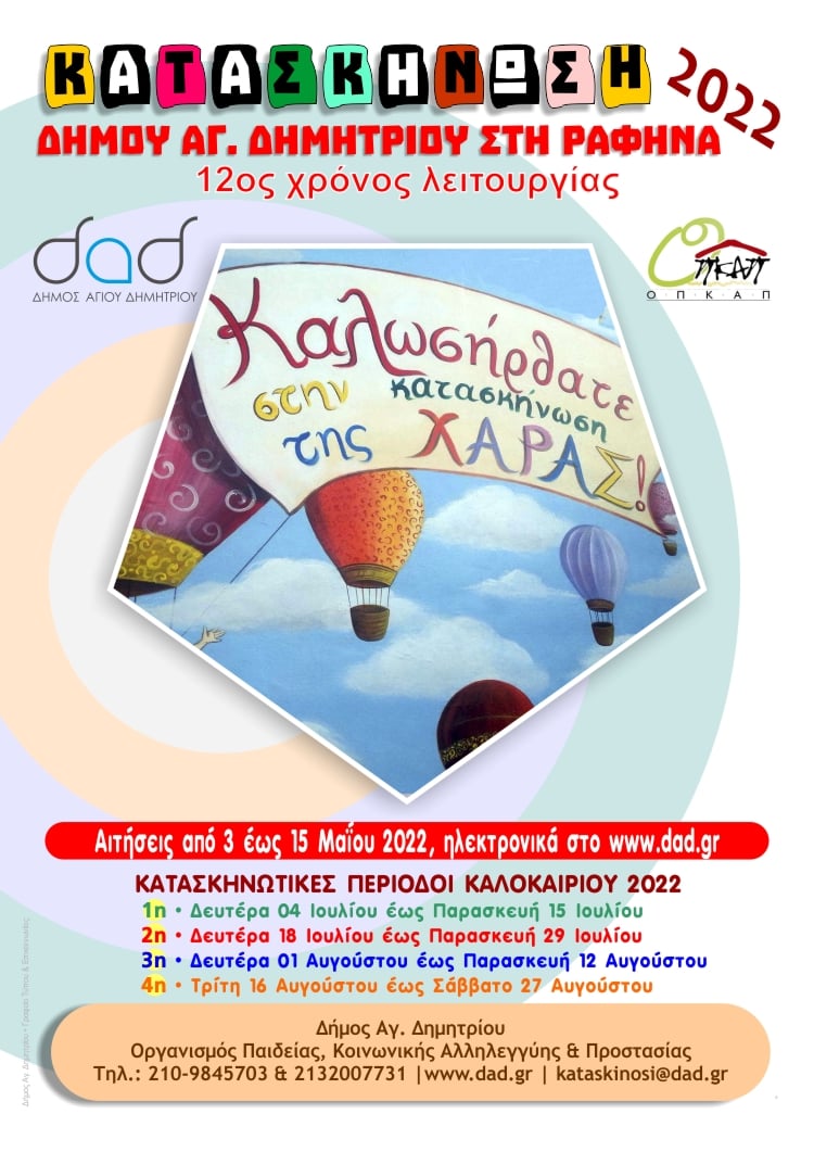 Μπαίνοντας στο 12ο χρόνο ανελλιπούς λειτουργίας, η Δημοτική Κατασκήνωση του Δήμου Αγίου Δημητρίου στη Ραφήνα είναι έτοιμη να υποδεχτεί τα παιδιά και αυτό το καλοκαίρι και να τους δώσει την ευκαιρία να απολαύσουν καλοκαιρινές διακοπές, να αποκομίσουν μοναδικές εμπειρίες και να καταγράψουν ανεξίτηλα στη μνήμη τους όμορφες στιγμές, σαν αυτές που μόνο η διαβίωση σε ένα κατασκηνωτικό περιβάλλον μπορεί να προσφέρει.