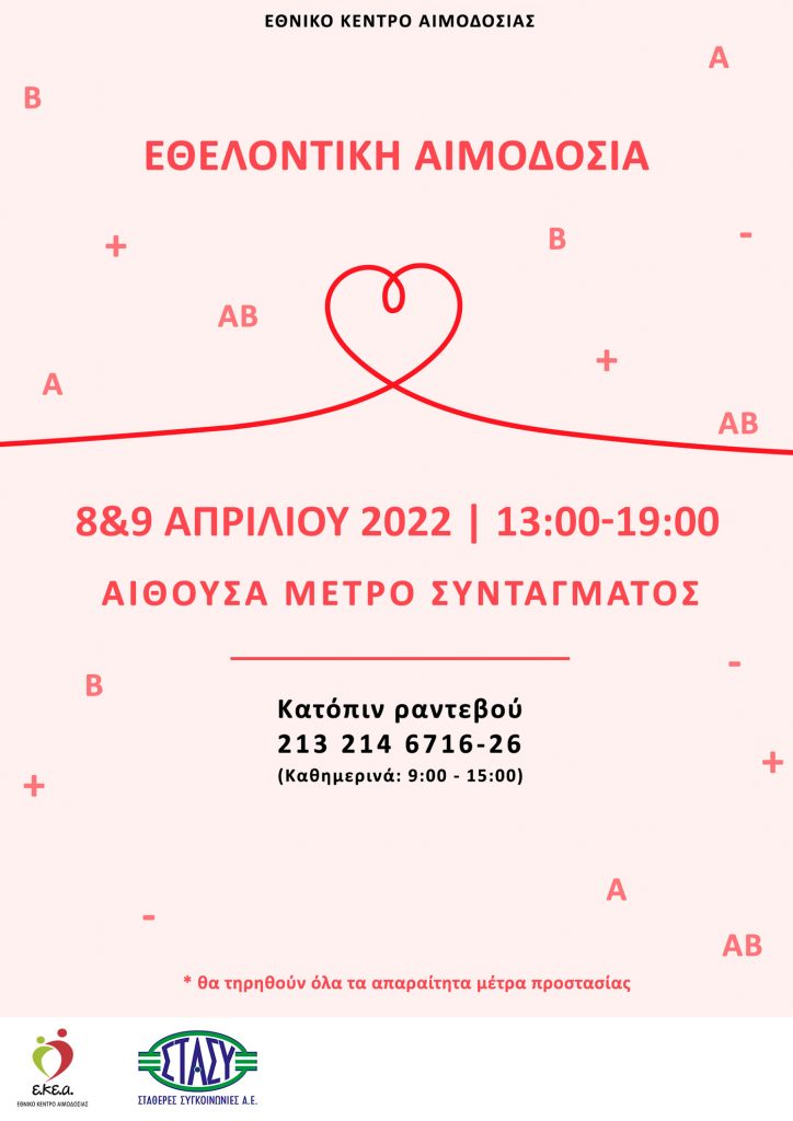 Στο πλαίσιο αυτό, το Εθνικό Κέντρο Αιμοδοσίας σε συνεργασία με τη ΣΤΑΣΥ, προγραμματίζει διήμερη εθελοντική αιμοδοσία στις 8 και 9 Απριλίου, στην αίθουσα πολλαπλών χρήσεων του Μετρό Συντάγματος.