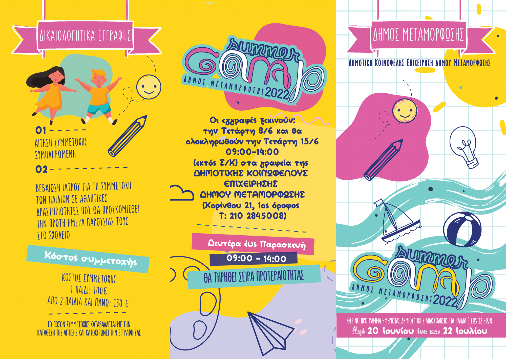 Μια μοναδική καλοκαιρινή εμπειρία με ασφάλεια, ξεγνοιασιά, παιχνίδι και δημιουργικές δραστηριότητες θα ζήσουν τα παιδιά από 5 έως 12 ετών από τις 20 Ιουνίου έως τις 22 Ιουλίου 2022 στις εγκαταστάσεις του 7ου και του 2ου Δημοτικού Μεταμόρφωσης.