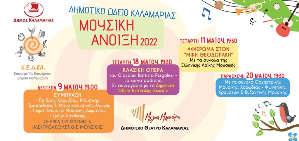 Την Τετάρτη 11/5, στις 19:30 θα παρουσιαστεί αφιέρωμα στον «Μίκη Θεοδωράκη», ενώ την Τετάρτη 18/5 και ώρα 19:30 σε μία σύμπραξη του Δημοτικού Ωδείου Καλαμαριάς, με το Δημοτικό Ωδείο Νεάπολης-Συκεών, θα παίξουν κλασική όπερα. Η Μουσική Άνοιξη θα ολοκληρωθεί την Παρασκευή 20/5, στις 19:30 με τα σύνολα Ορχηστρικής Μουσικής, Χορωδίας-Φωνητικής, Κρουστών & Βυζαντινής Μουσικής.
