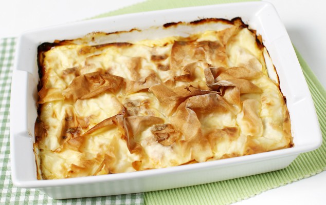 - Λαδώνετε ένα ταψί και στρώνετε το πρώτο φύλλο. Το λαδώνετε με λίγο λάδι και βάζετε μια στρώση από το μείγμα των τυριών. Συνεχίζετε με το δεύτερο φύλλο και ξαναβάζετε τυριά. Τέλος τοποθετείτε το τρίτο φύλλο με τα τυριά που έχουν μείνει και σκεπάζετε με το τελευταίο φύλλο. Δεν ξεχνάτε να λαδώνετε τα φύλλα.