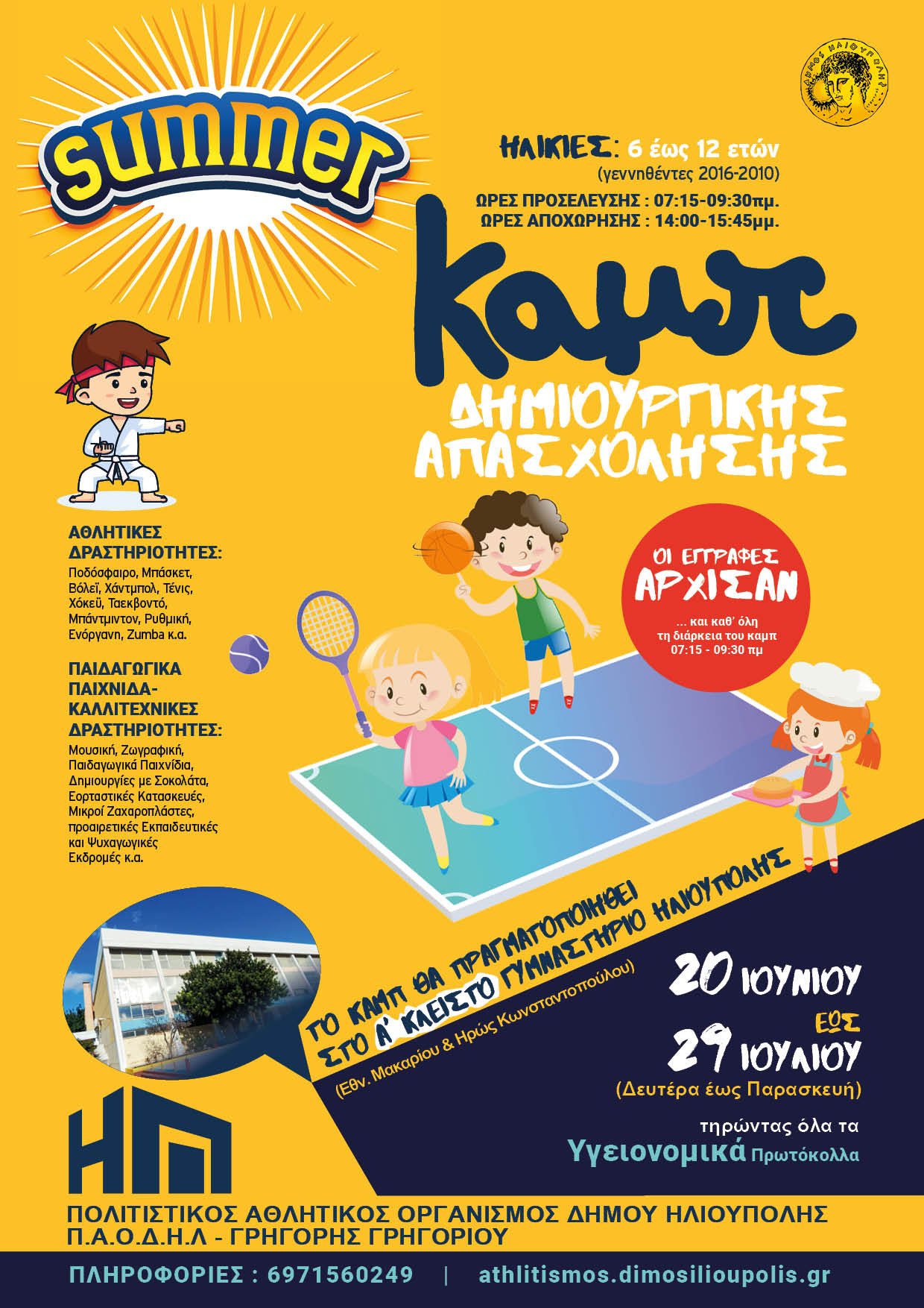 Με την αιγίδα του Πολιτιστικού και Αθλητικού Οργανισμού Δήμου Ηλιούπολης – Π.Α.Ο.Δ.ΗΛ, πραγματοποιείται Καμπ Δημιουργικής & Αθλητικής Απασχόλησης, στο Α΄ Κλειστό Γυμναστήριο Ηλιούπολης, Εθνάρχου Μακαρίου & Ηρώς Κωνσταντοπούλου, κατά τη θερινή περίοδο των Σχολικών Διακοπών, από τη Δευτέρα 20 Ιουνίου έως την Παρασκευή 29 Ιουλίου 2022, χωρίς να συμπεριλαμβάνονται τα Σαββατοκύριακα.