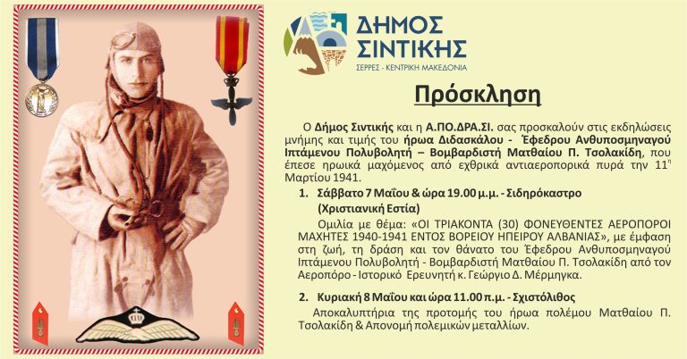 Εκδηλώσεις μνήμης και τιμής για τον ήρωα-διδάσκαλο και Έφεδρο Αεροπόρο Ματθαίο Τσολακίδη, θα πραγματοποιηθούν στον Δήμο Σιντικής το Σαββατοκύριακο 7 και 8 Μαϊου