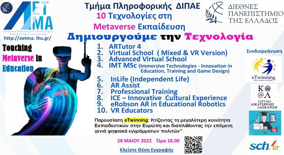 To Θεσμοθετημένο Ερευνητικό Εργαστήριο AETMA Lab Τμήματος Πληροφορικής του Διεθνούς Πανεπιστημίου Ελλάδος σε συνεργασία με το e-twinning, το Ίδρυμα Αικατερίνης Λασκαρίδη, το ΠΣΔ, και την Ομάδα Εξ Αποστάσεως Εκπαίδευσης διοργανώνουν διαδικτυακή ημερίδα στις 28 Μαΐου (ώρα έναρξης 18.00) με θέμα “10 Τεχνολογίες στη Metaverse Εκπαίδευση“.