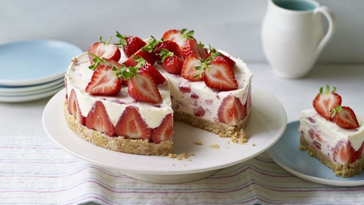Το απλώνεις πάνω στη βάση με το μπισκότο και βάζεις το γλυκό στο ψυγείο μέχρι να σταθεροποιηθεί η κρέμα. Λίγο πριν σερβίρεις χτυπάς στο μπλέντερ τις φράουλες με τη ζάχαρη και το χυμό λεμονιού μέχρι να γίνουν πολτός