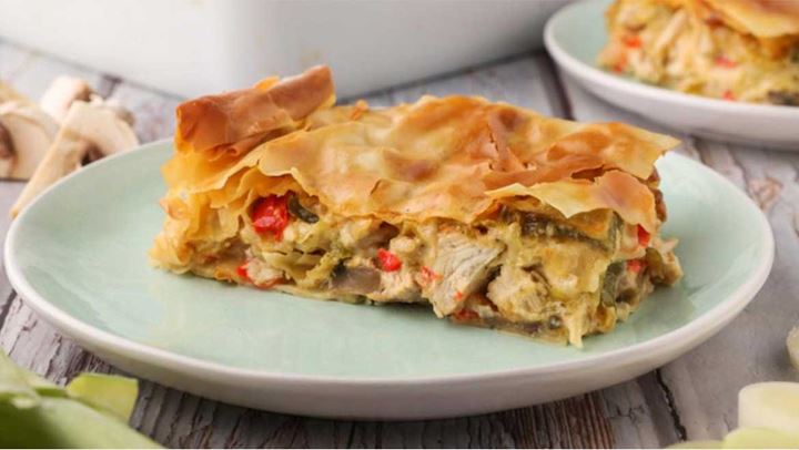 Κατόπιν, τοποθετούμε 2 φύλλα ακριβώς από πάνω, τα λαδώνουμε κι αυτά και απλώνουμε ομοιόμορφα την υπόλοιπη γέμιση. Ύστερα, τοποθετούμε 2 φύλλα ακόμα από πάνω, τα λαδώνουμε κι αυτά και κλείνουμε καλά τις άκρες της πίτας. Τέλος, λαδώνουμε ξανά την πίτα, την χαράσσουμε στα 8 και την ψήνουμε σε προθερμασμένο φούρνο στους 180°C στον αέρα για 1 ώρα.
