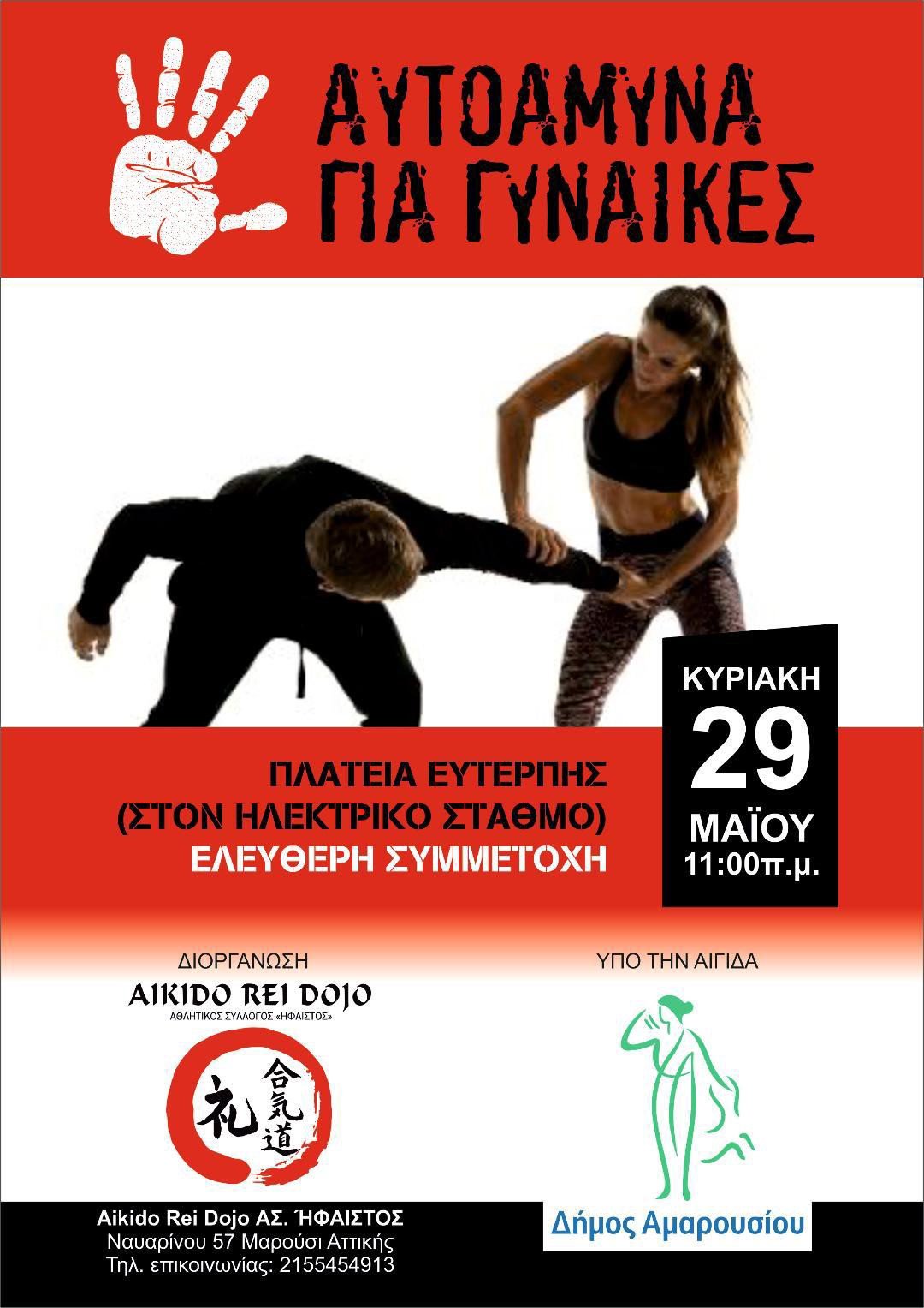 Με την υποστήριξη του Δήμου Αμαρουσίου και της αρμόδιας Διεύθυνσης Αθλητισμού & Πολιτισμού πραγματοποιούνται την Κυριακή 29 Μαϊου 2022, στις 11:00, στην πλατεία Ευτέρπης (ΗΣΑΠ) μαθήματα αυτοάμυνας για γυναίκες, με οργανωτική ευθύνη του Αθλητικού Συλλόγου «Aikido Rei Dojo ΉΦΑΙΣΤΟΣ».