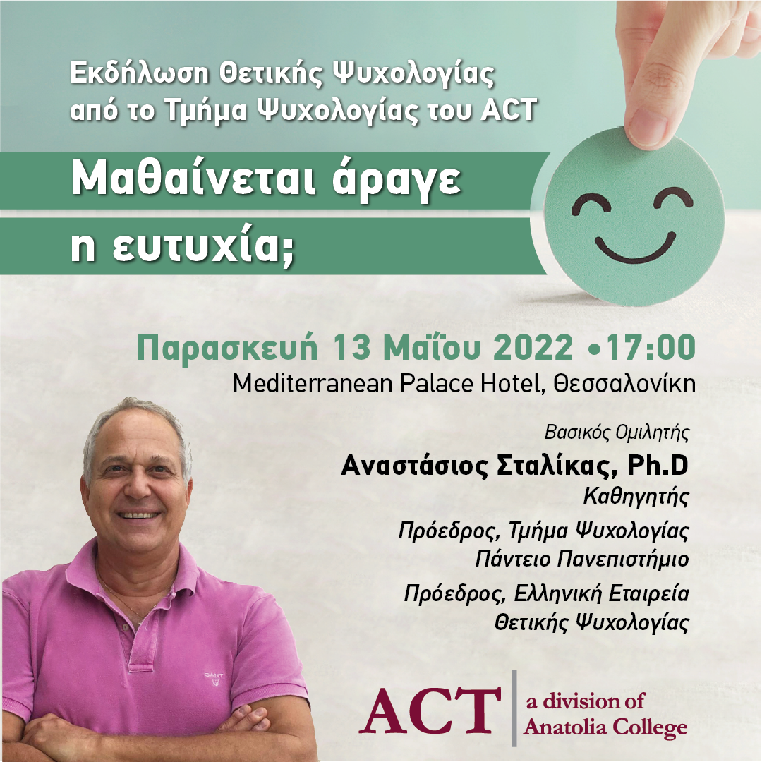 Ένα από τα ζητούμενα της σημερινής εποχής, η ανάπτυξη της θετικότητας, είναι το θέμα της ανοιχτής διά ζώσης εκδήλωσης που διοργανώνει το Τμήμα Ψυχολογίας του ACT – American College of Thessaloniki, την Παρασκευή 13 Μαίου 2022, στις 17:00, στο ξενοδοχείο Mediterranean Palace Hotel στη Θεσσαλονίκη.
