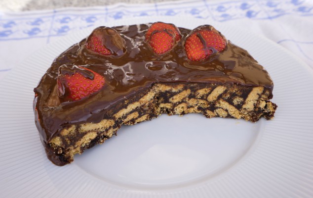 - Βγάζετε το γλυκό από το ψυγείο, το ξεφορμάρετε, περιχύνετε με τη σοκολάτα, στολίζετε με τις φράουλες και σερβίρετε.