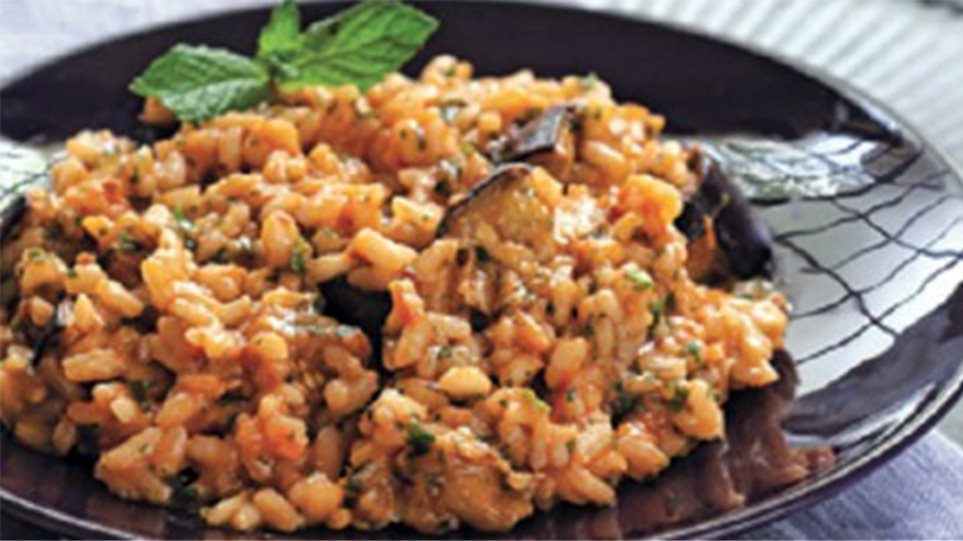 Διαδικασία: Πλένετε και τεμαχίζετε σε κύβους τις μελιτζάνες. Τις σοτάρετε με το ελαιόλαδο ελαφρά. σοτάρετε το κρεμμύδι ψιλοκομμένο. Καθαρίζετε, πλένετε τα κρεμμυδάκια, τα κόβετε και τα σοτάρετε κι αυτά. Σβήνετε με τις ντομάτες, που έχετε ψιλοκόψει. Προσθέτετε το μαϊντανό, αλατοπιπερώνετε και αφήνετε να ψηθεί για 15 περίπου λεπτά. Όταν αρχίσουν να μαλακώνουν οι μελιτζάνες, προσθέτετε 1 1/2 ποτήρι νερό και ρίχνετε το ρύζι. Αφήνετε το ρύζι να βράσει όταν το φαγητό είναι έτοιμο προσθέτετε την κανέλα και σερβίρετε.