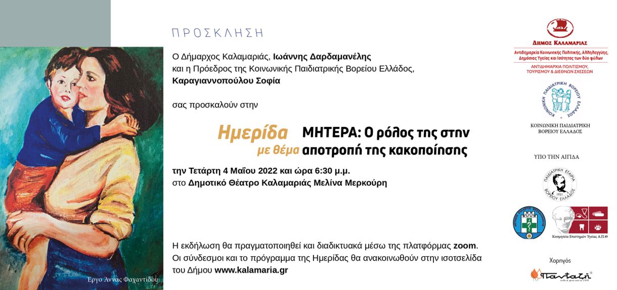 Τη δεύτερη Κυριακή του Μάη εορτάζεται η ημέρα της μητέρας, ένα πρόσωπο που έχει καθοριστικό ρόλο στη ζωή όλων. Λίγες μέρες πριν από την ξεχωριστή αυτή γιορτή, ο Δήμος Καλαμαριάς σε συνεργασία με την Κοινωνική Παιδιατρική Βορείου Ελλάδος, διοργανώνει ημερίδα, προκειμένου να αναδείξει τον ρόλο που μπορεί να διαδραματίσει μία μάνα στην αποτροπή της κακοποίησης.
