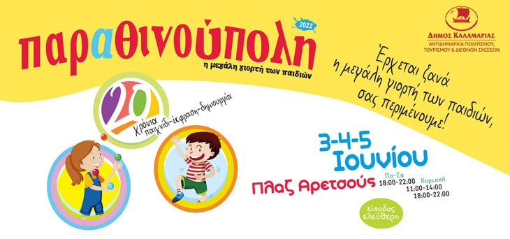 Η Παραθινούπολη επιστρέφει στην Πλαζ Αρετσούς στην Καλαμαριά από την Παρασκευή 3 έως και την Κυριακή 5 Ιουνίου 2022, η μεγάλη γιορτή των παιδιών με ελεύθερη είσοδο, που φέτος συμπληρώνει 20 χρόνια δημιουργίας.