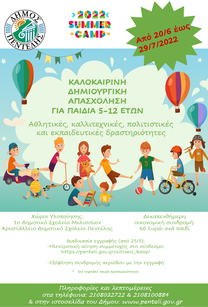 Ο Δήμος Πεντέλης ενημερώνει ότι θα υλοποιήσει πρόγραμμα καλοκαιρινής δημιουργικής απασχόλησης παιδιών ηλικίας από 5 έως 12 ετών, από Δευτέρα 20/6/2022 μέχρι Παρασκευή 29/7/2022.
