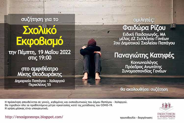 Η Ένωση Γονέων Παπάγου-Χολαργού προσκαλεί στη συζήτηση που διοργανώνει με θέμα τον σχολικό εκφοβισμό. Η εκδήλωση θα πραγματοποιηθεί την Πέμπτη 19 Μαϊου 2022, στις 19:00, στο αμφιθέατρο «Μίκης Θεοδωράκης», στο δημαρχείο Παπάγου-Χολαργού.