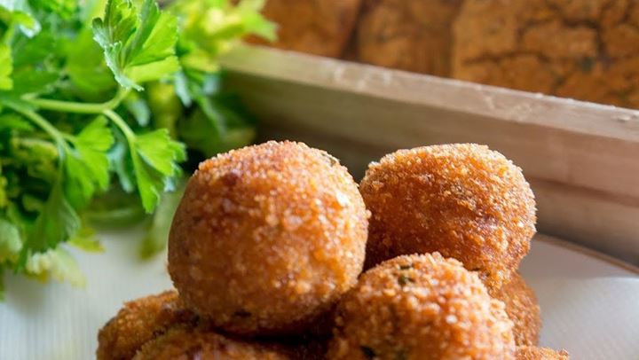 Ζυμώστε με τα χέρια σας και πλάστε μπαλάκια σε σχήμα καρυδιού ή πλακέ. Βουτήξτε τα μπαλάκια στο αλεύρι, έπειτα στο αυγό και τέλος στην τριμμένη φρυγανιά.
