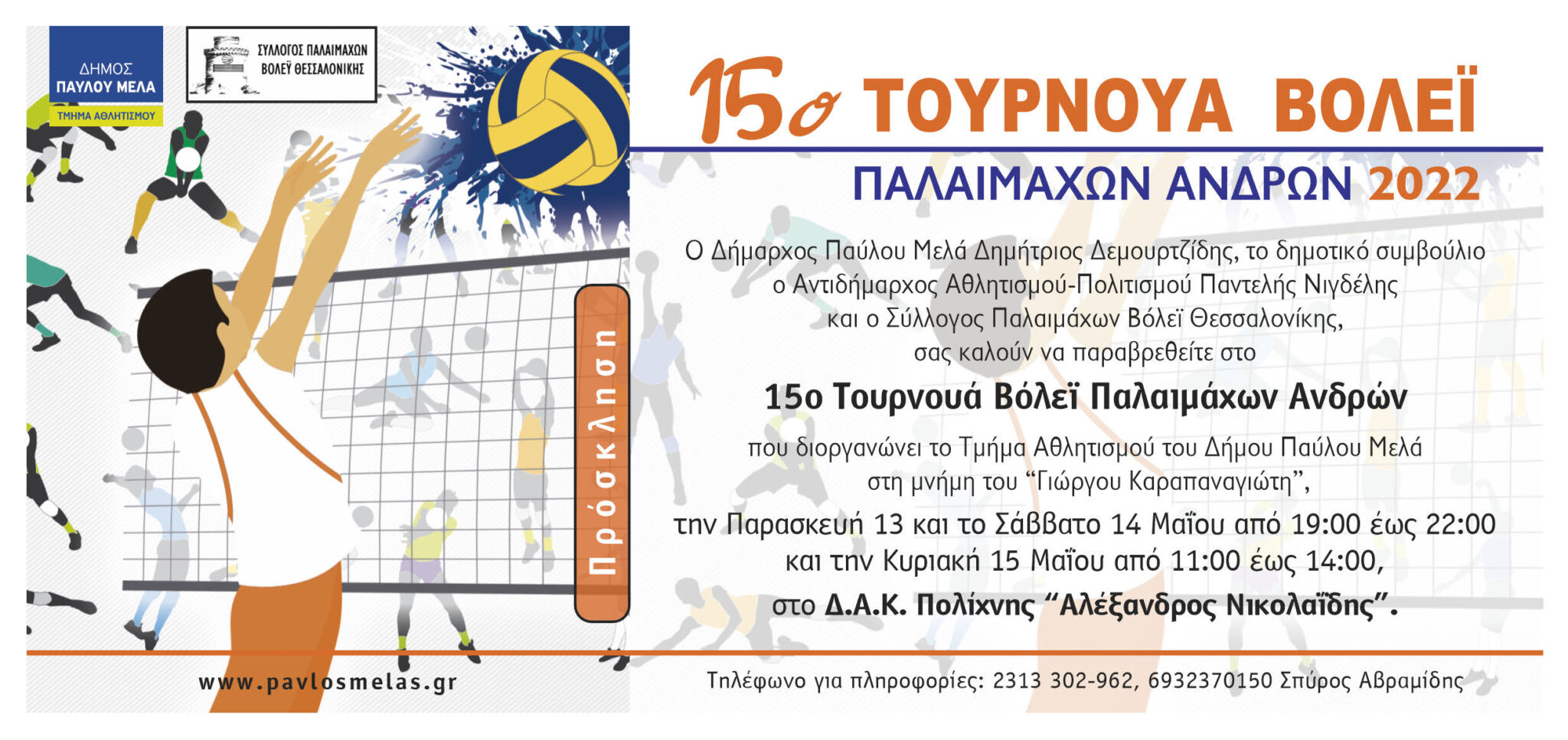 Το Τμήμα Αθλητισμού του Δήμου Παύλου Μελά, σε συνεργασία με τον Σύλλογο Παλαιμάχων Βόλεϊ Θεσσαλονίκης διοργανώνουν το 15ο Τουρνουά Βόλεϊ Παλαιμάχων Ανδρών “Γιώργος Καραπαναγιώτης” στο ΔΑΚ Πολίχνης Αλέξανδρος Νικολαΐδης στις 13, 14, 15 Μαΐου 2022.