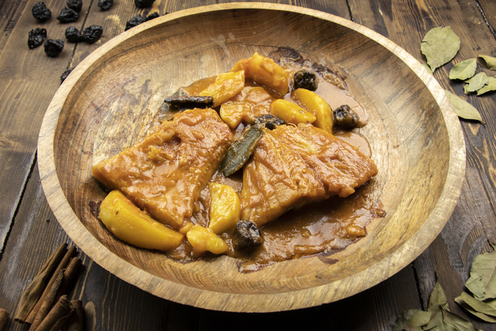 Αγιορείτικος μπακαλιάρος με πατάτες και δαμάσκηνα