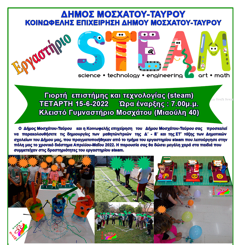 Ο Δήμος Μοσχάτου-Ταύρου και η Κοινωφελής Επιχείρηση του Δήμου, σας προσκαλούν να παρακολουθήσετε τις δημιουργίες των μαθητών/τριών της Δ΄-Ε΄ και της Στ΄ τάξης των Δημοτικών σχολείων του Δήμου μας, που πραγματοποιήθηκαν από το τμήμα εργαστηρίου Steam.