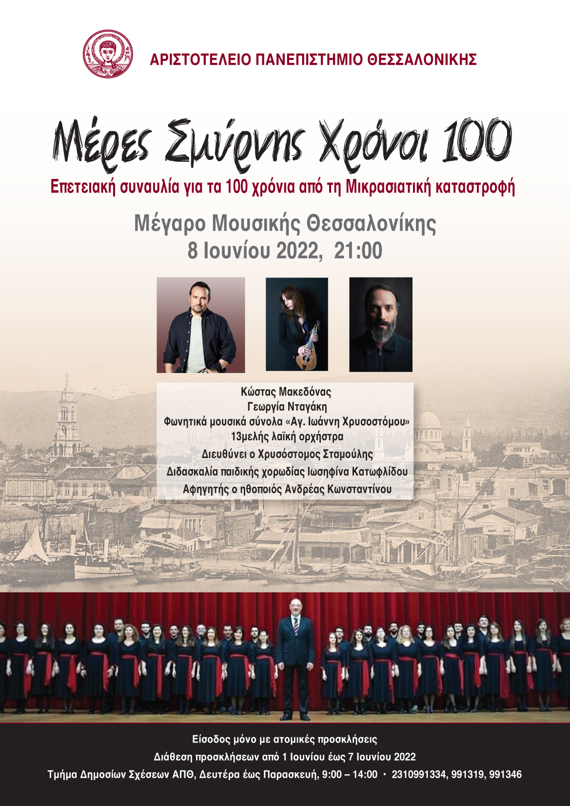 Το Αριστοτέλειο Πανεπιστήμιο Θεσσαλονίκης τιμά την επέτειο των 100 χρόνων από τη Μικρασιατική καταστροφή με μία μεγάλη συναυλία μνήμης, την Τετάρτη 8 Ιουνίου 2022 και ώρα 21.00, στο Μέγαρο Μουσικής Θεσσαλονίκης.