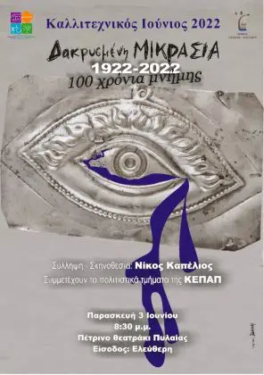 Μετά τη δοκιμασία της πανδημίας ο Καλλιτεχνικός Ιούνιος, η επιτυχημένη διοργάνωση του δήμου Πυλαίας – Χορτιάτη επιστρέφει δυναμικά. Η φετινή χρονιά το 2022 έχει έναν ιδιαίτερο συμβολισμό για όλους τους Έλληνες καθώς συμπληρώνονται 100 χρόνια από την κορύφωση της Μικρασιατικής Καταστροφής. Θέλοντας να τιμήσει την «μαύρη» επέτειο, δηλώνοντας «Ποτέ ξανά, χαμένες Πατρίδες για τον Ελληνισμό» η Κοινωφελής Επιχείρηση Πολιτισμού, Αθλητισμού και Περιβάλλοντος του Δήμου Πυλαίας Χορτιάτη κάνει την πρεμιέρα του Καλλιτεχνικού Ιουνίου 2022 με μια ξεχωριστή εκδήλωση που θα μας ταξιδέψει… στον χώρο και στον χρόνο στο τώρα και στο τότε μέσα από ένα μωσαϊκό θεατρικού αναλογίου με σπάνιες ψηφίδες αφήγησης μουσικής τραγουδιών και χορών της Μικρασίας για τις πατρίδες που χάθηκαν, αλλά παραμένουν για πάντα αλησμόνητες.
