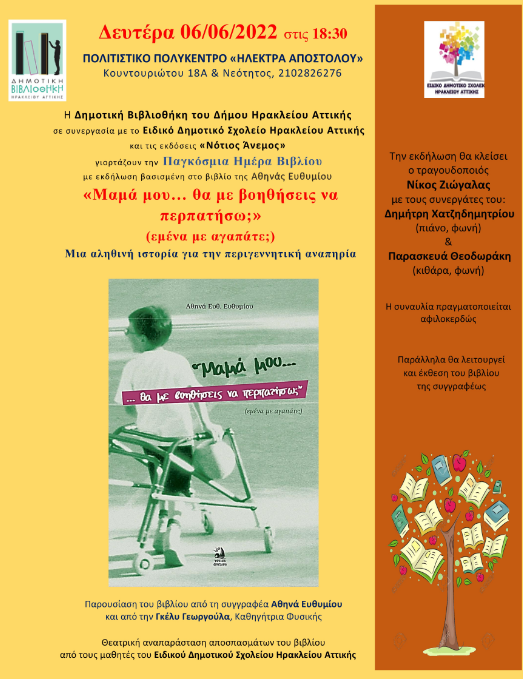 «Μαμά μου… θα με βοηθήσεις να περπατήσω;». Η Δημοτική Βιβλιοθήκη του Δήμου Ηρακλείου Αττικής γιορτάζει την Παγκόσμια Ημέρα Βιβλίου και οργανώνει μια μοναδική γιορτή, αφιερωμένη στα παιδιά με αναπηρία, παρουσιάζοντας το ομώνυμο βιβλίο της Αθηνάς Ευθυμίου, τη Δευτέρα 6 Ιουνίου, στις 18.30 το απόγευμα, στο Πολιτιστικό Κέντρο «Ηλέκτρα Αποστόλου» (Κουντουριώτου & Νεότητος).