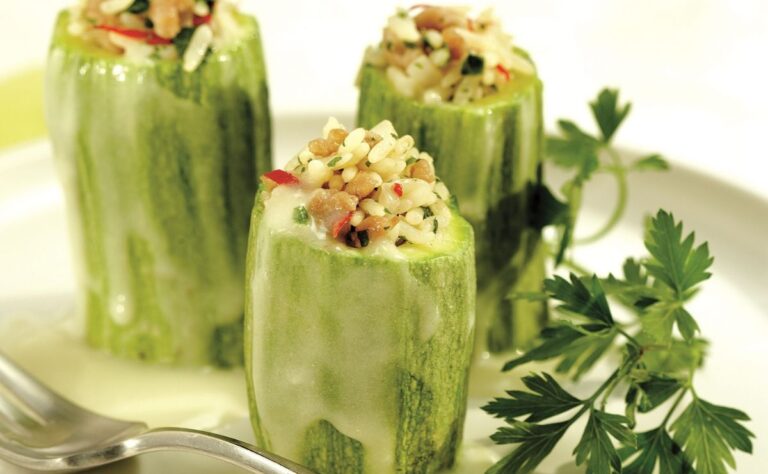 - Κόβετε τα κολοκυθάκια στη μέση οριζοντίως. Αφαιρείτε με το ειδικό εργαλείο αρκετή από τη σάρκα τους. Ζεσταίνετε 6 κουταλιές της σούπας λάδι και σοτάρετε τα κρεμμύδια και τον κιμά 6΄-8΄. Προσθέτετε το ρύζι, ανακατεύετε και κατόπιν ρίχνετε 150 ml ζεστό νερό, την πιπερίτσα (προαιρετικά) και το αλατοπίπερο.