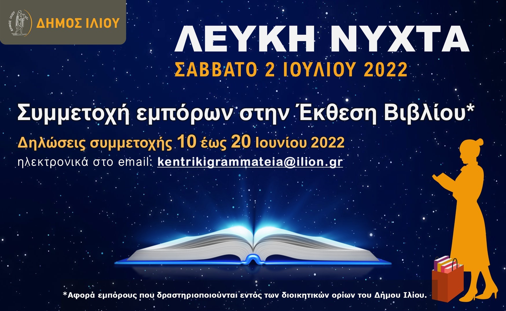 Στο πλαίσιο της εκδήλωσης «ΛΕΥΚΗ ΝΥΧΤΑ» που θα πραγματοποιηθεί το Σάββατο 2 Ιουλίου 2022, ο Δήμος Ιλίου πρόκειται να διοργανώσει έκθεση βιβλίου για τους εμπόρους που δραστηριοποιούνται εντός των διοικητικών του ορίων, επί της οδού Πάριδος (μεταξύ των παράλληλων οδών Φιλοκτήτου και Μανάκη).