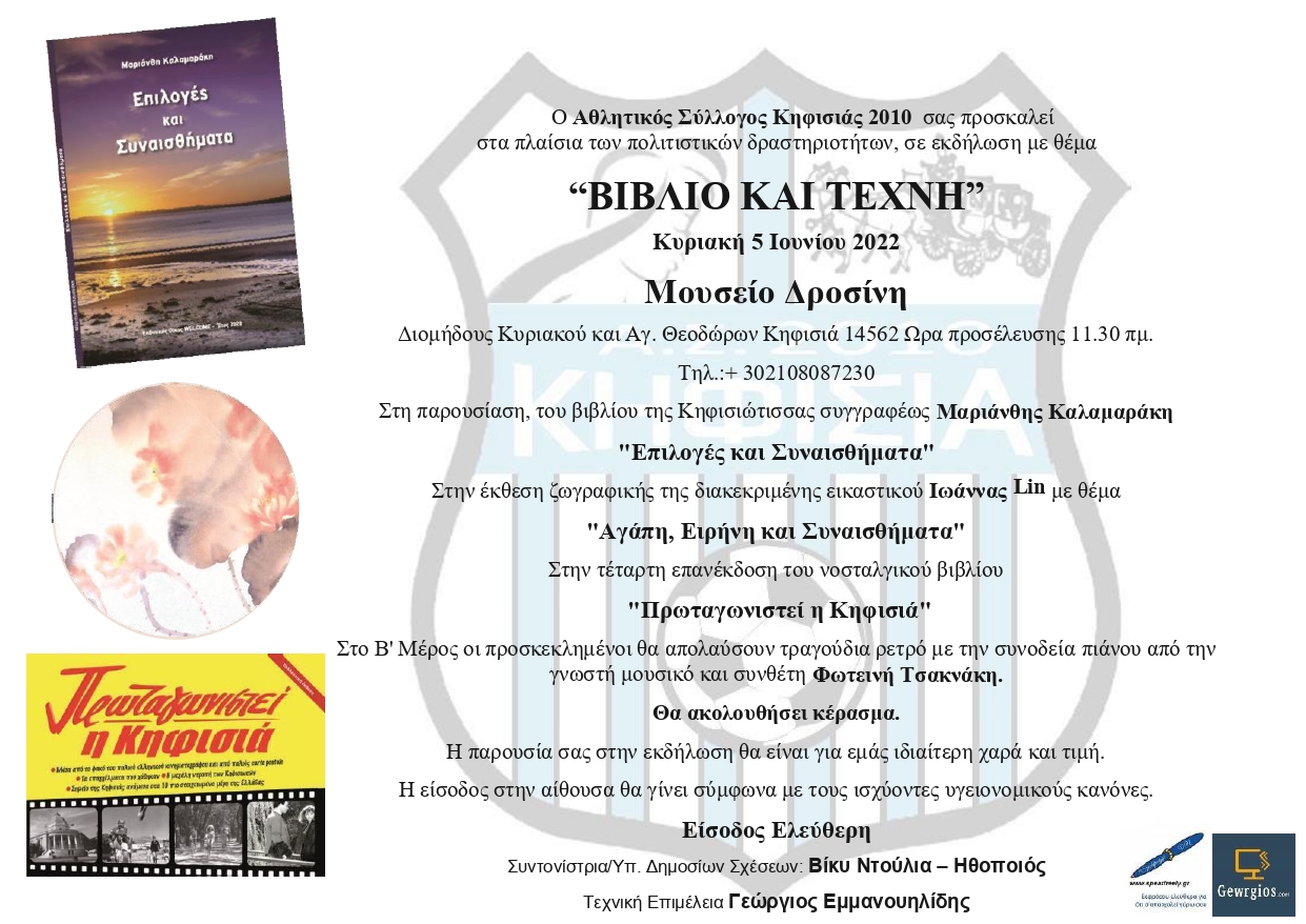 Ο Αθλητικός Σύλλογος Κηφισιάς 2010, στα πλαίσια των πολιτιστικών του δραστηριοτήτων, διοργανώνει στις 5 Ιουνίου 2022 ημέρα Κυριακή και ώρα 11.30 πμ, εκδήλωση στην Αίθουσα Δροσίνη, οδός Διομήδους Κυριακού και Αγίων Θεοδώρων, στην Κηφισιά.